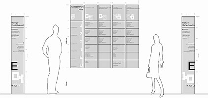 Für den Neubau des Justizzentrums in Jena wurde ein auf die Bedürfnisse des Nutzers und die baulichen Gegebenheiten abgestimmtes Orientierungssystem entwickelt. Dabei wurde das Grundrisslogo als Orientierungshilfe grafisch integriert.