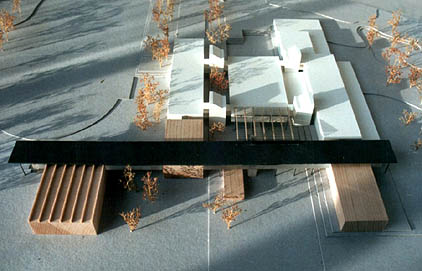 Eingang. Die teilweise aufgeständerte neue Konstruktion steht mit ihrer Leichtigkeit und